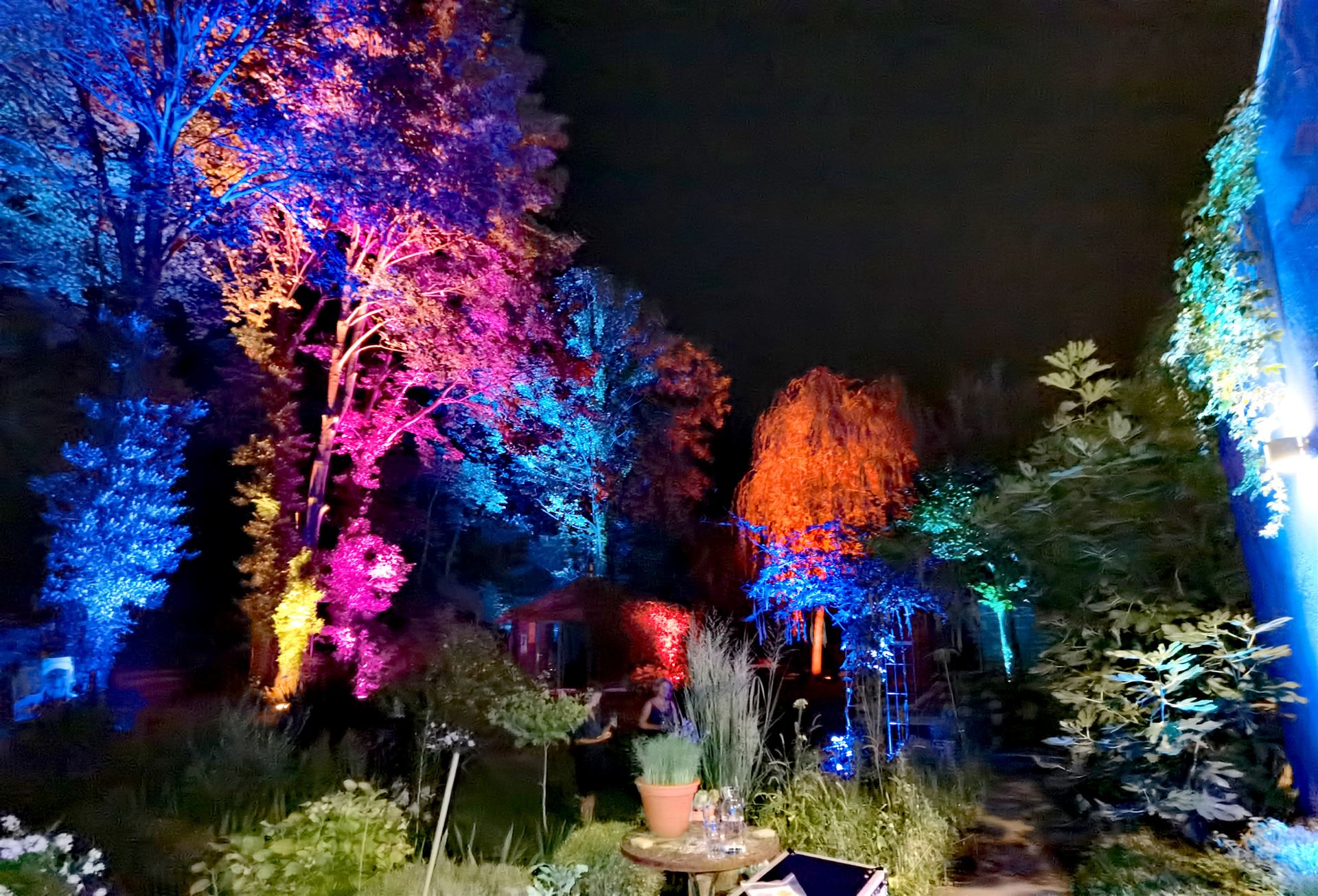 Wetterfester IP65 LED-Akku-Scheinwerfer mit R+G+B+A+W Farben für den Außenbereich.